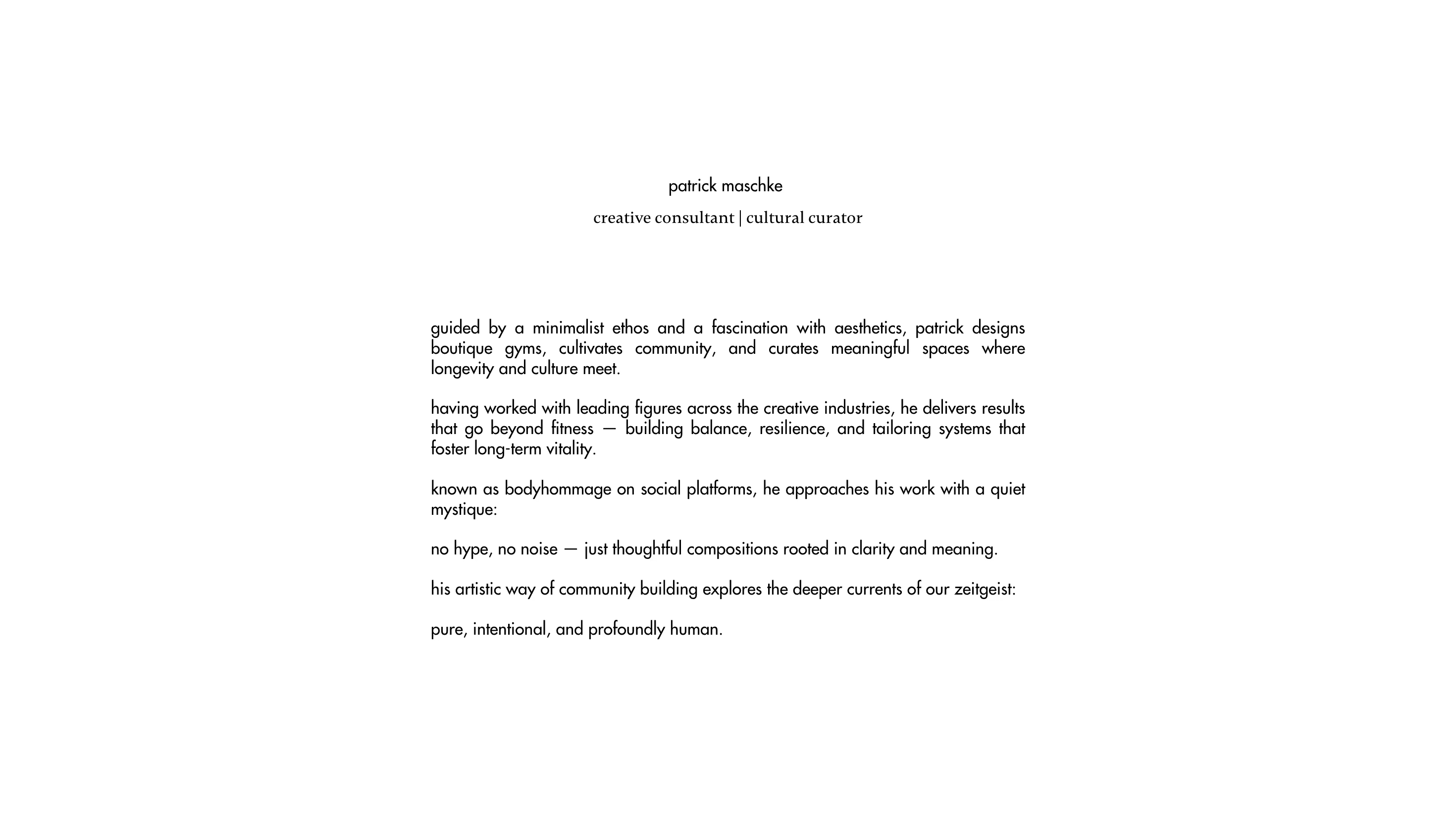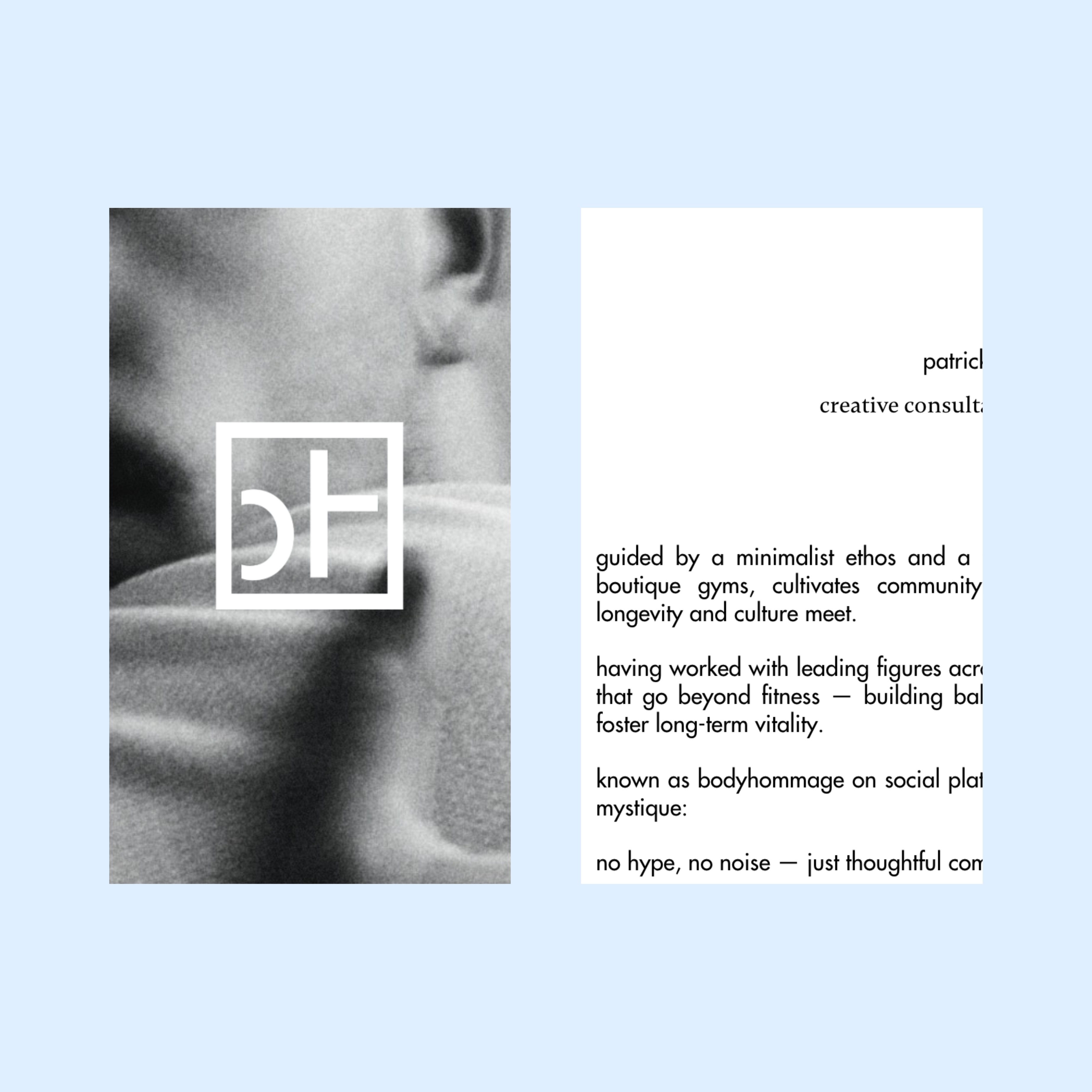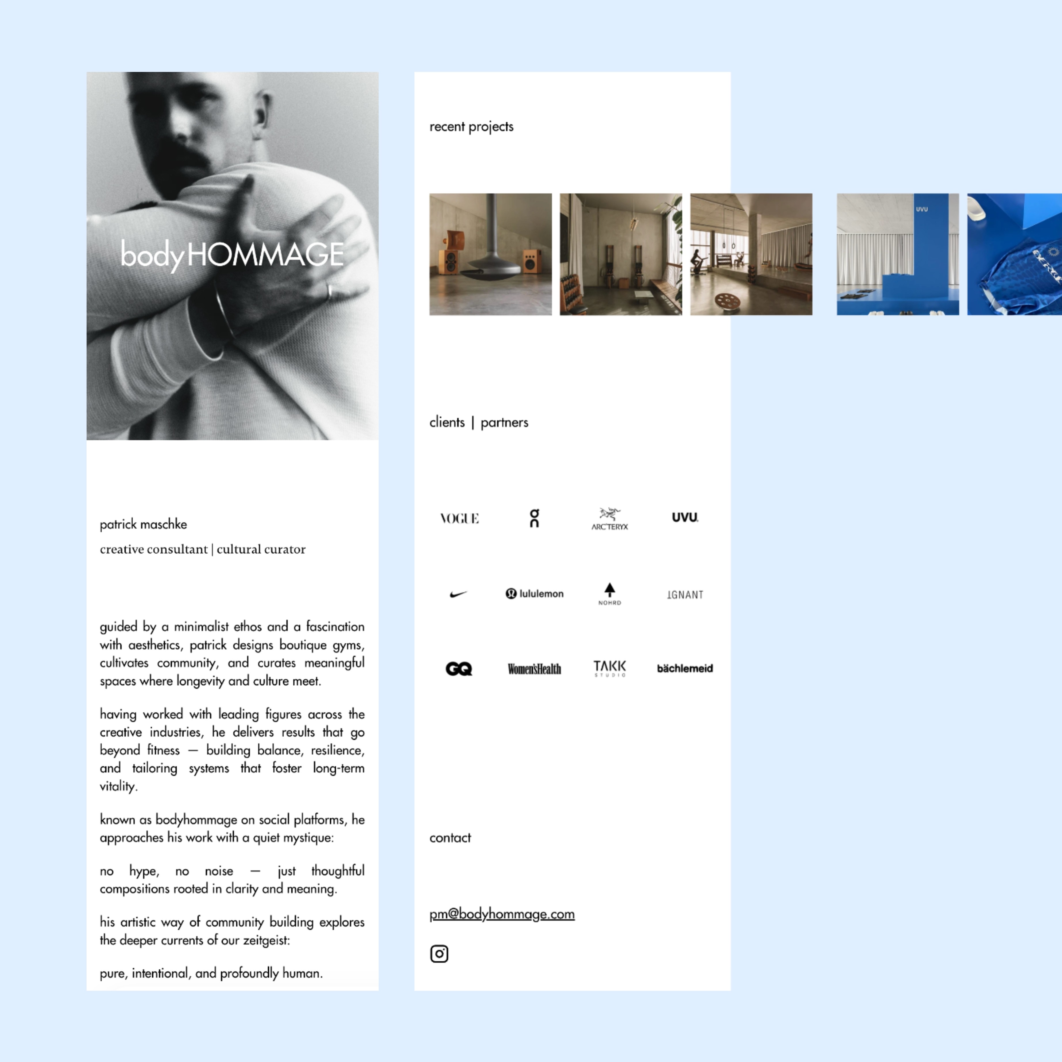 bodyhommage.com is a personal portfolio and intro platform built to communicate artistic intent with clarity and restraint.